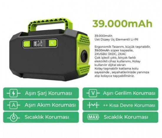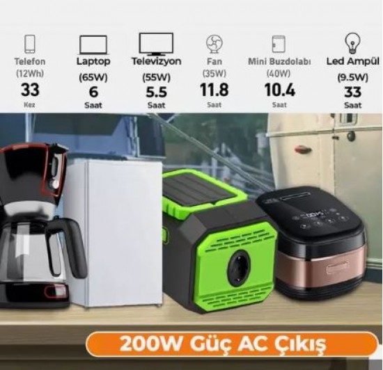 200w A1 39.000mah Taşınabilir Portatif Güç İstasyonu ile Telefon, Laptop, Televizyon, Fan, Mini Buzdolabı ve Led Ampul gibi bir çok farklı elektrikli cihazınız ile kullanılabilir.